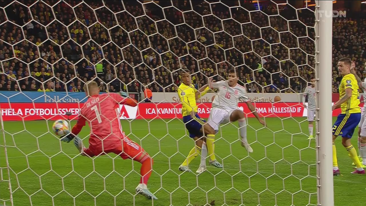 ¡La que acaba de sacar Robin Olsen! Manotazo milagroso tras remate a bocajarro de Rodri