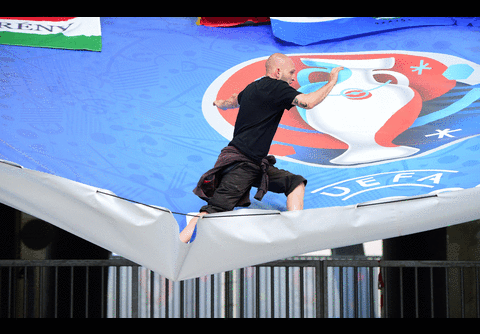 En el partido ante Islandia en el Estadio Velodrome de Marsella el aficionado trató de correr por una lona sin medir las consencuencias.