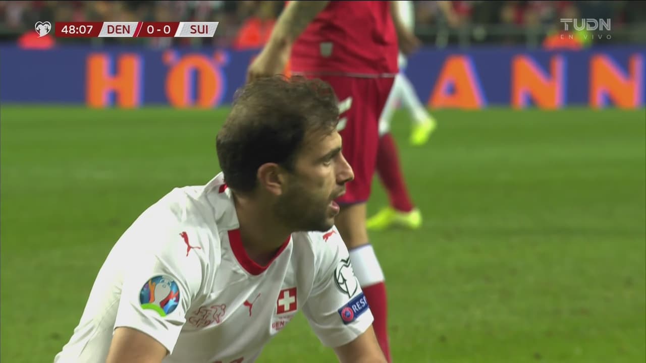 El delantero recibe el esférico solo ante Schmaichel y lo envía por arriba del arco de Dinamarca.