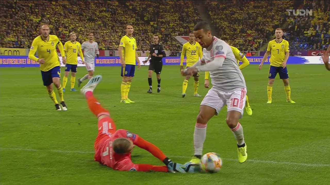 ¡Por hacer una de más! Thiago tiene a quemarropa al arquero, quiere dribarlo y se la pierde