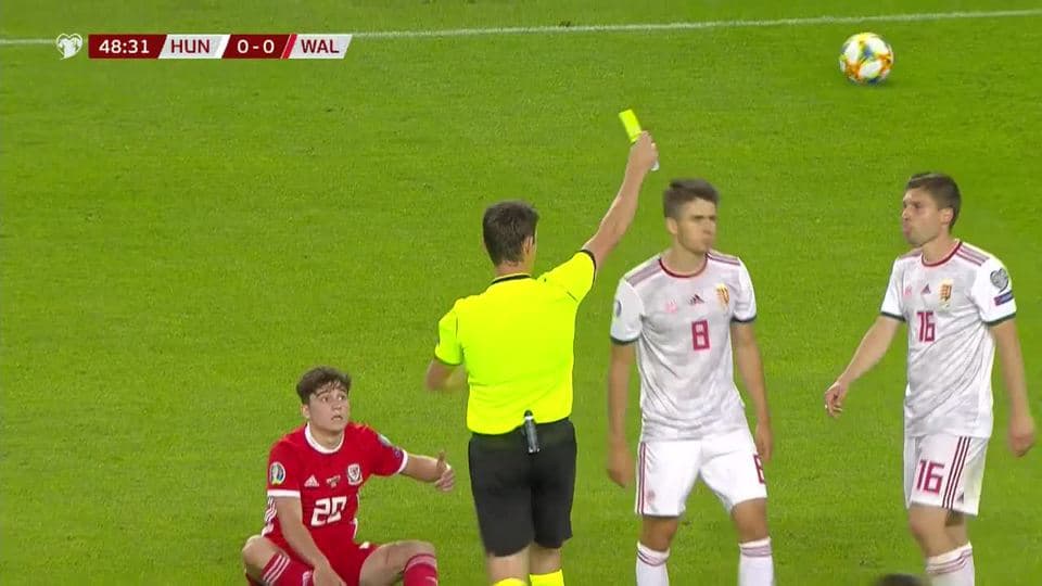Tarjeta amarilla. El árbitro amonesta a Ádám Nagy de Hungary on June 11, 2019