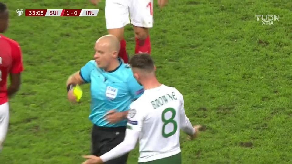 Tarjeta amarilla. El árbitro amonesta a Alan Browne de Republic of Ireland