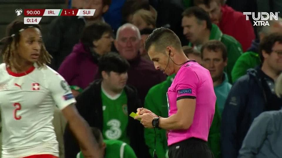 Tarjeta amarilla. El árbitro amonesta a Alan Judge de Republic of Ireland on September 5, 2019