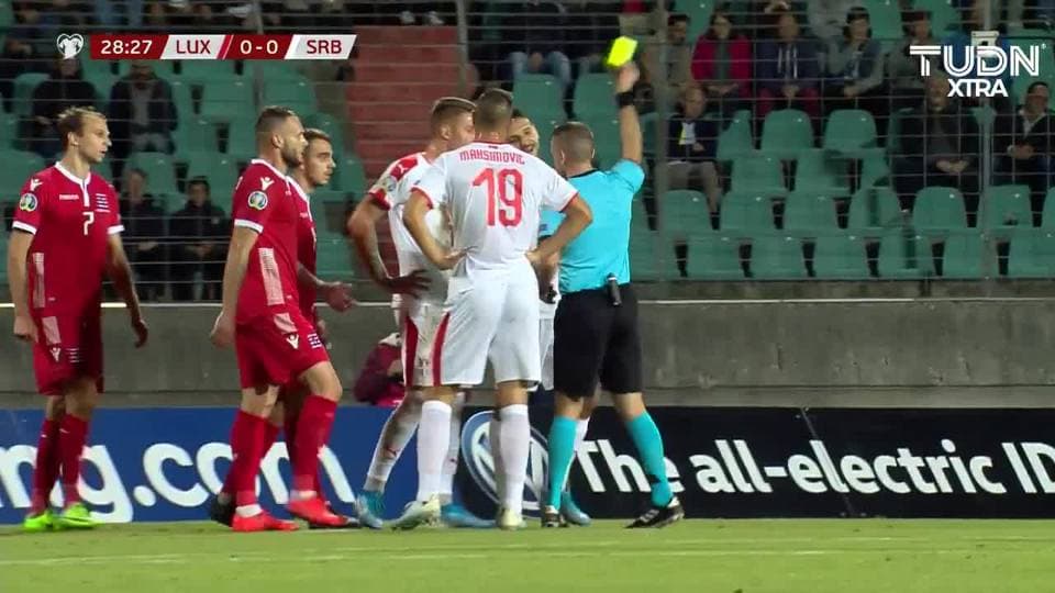 Tarjeta amarilla. El árbitro amonesta a Aleksandar Mitrovic de Serbia on September 10, 2019