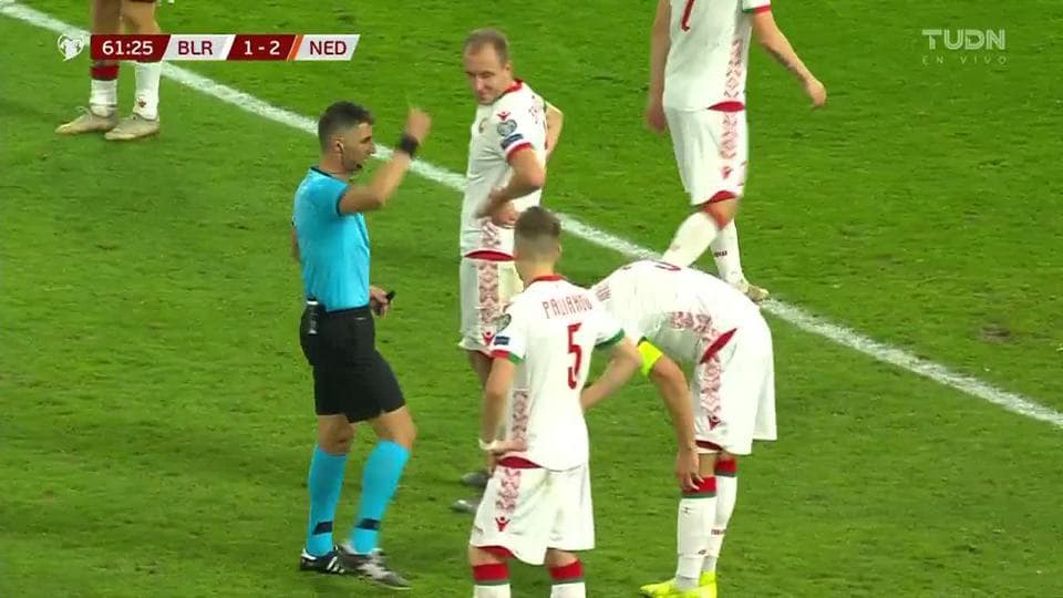 Tarjeta amarilla. El árbitro amonesta a Aleksandr Martynovich de Belarus