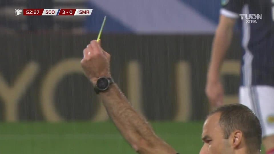 Tarjeta amarilla. El árbitro amonesta a Alessandro Golinucci de San Marino