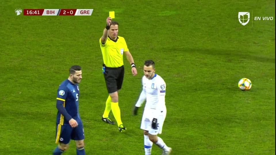 Tarjeta amarilla. El árbitro amonesta a Anastasios Donis de Greece