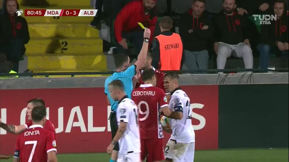 Tarjeta amarilla. El árbitro amonesta a Anatol Prepelita de Moldova