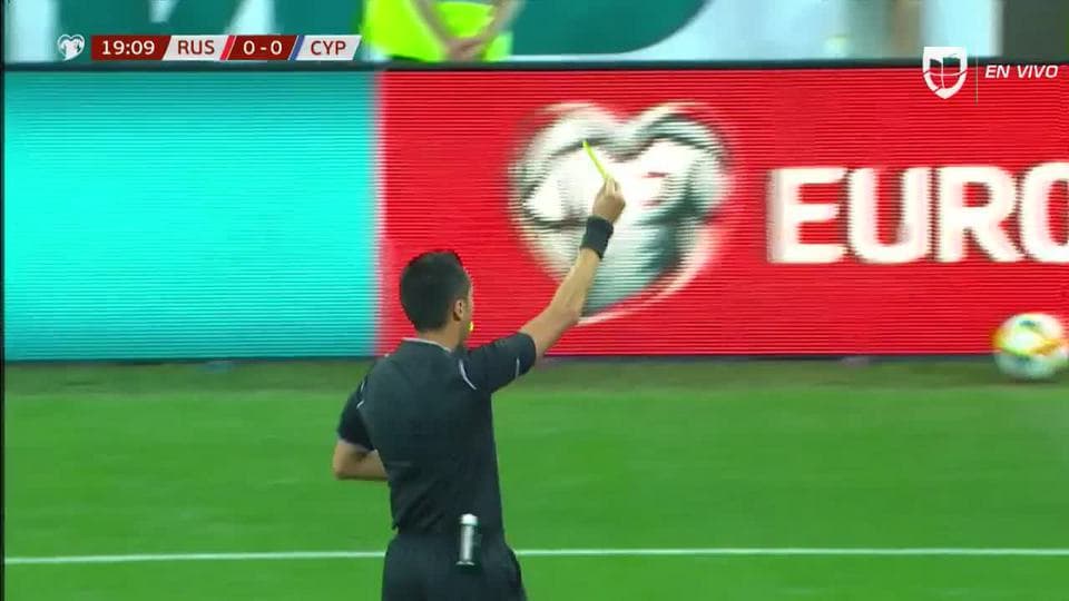 Tarjeta amarilla. El árbitro amonesta a Andreas Makris de Cyprus on June 11, 2019