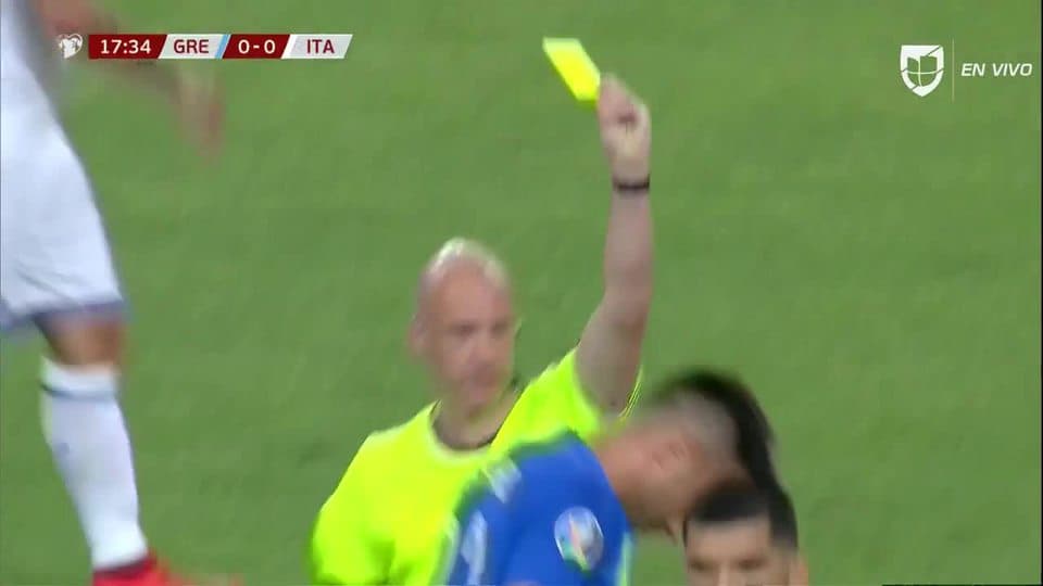 Tarjeta amarilla. El árbitro amonesta a Andreas Samaris de Greece on June 8, 2019