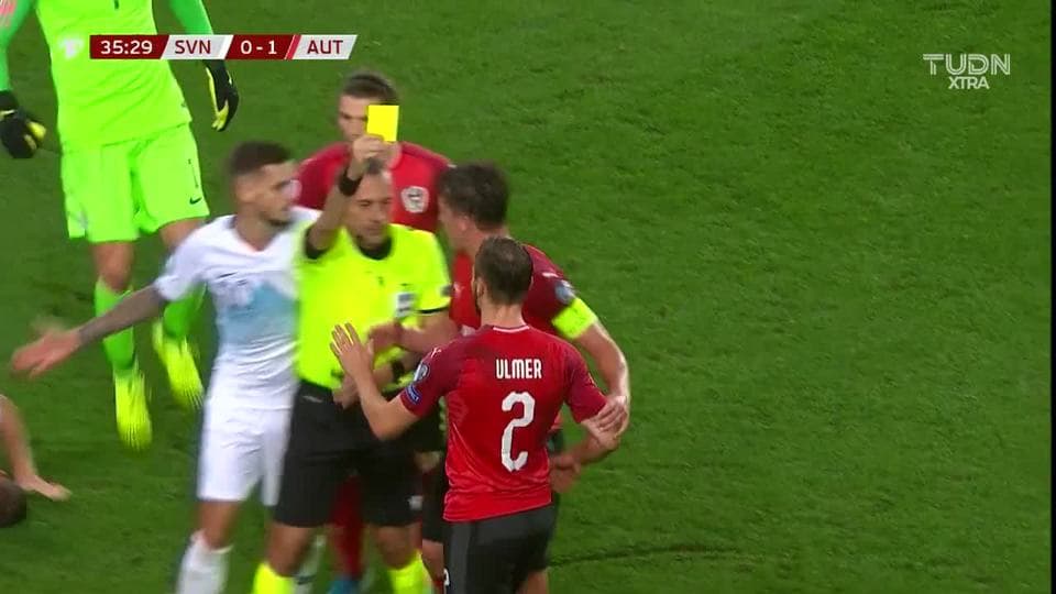 Tarjeta amarilla. El árbitro amonesta a Andreas Ulmer de Austria