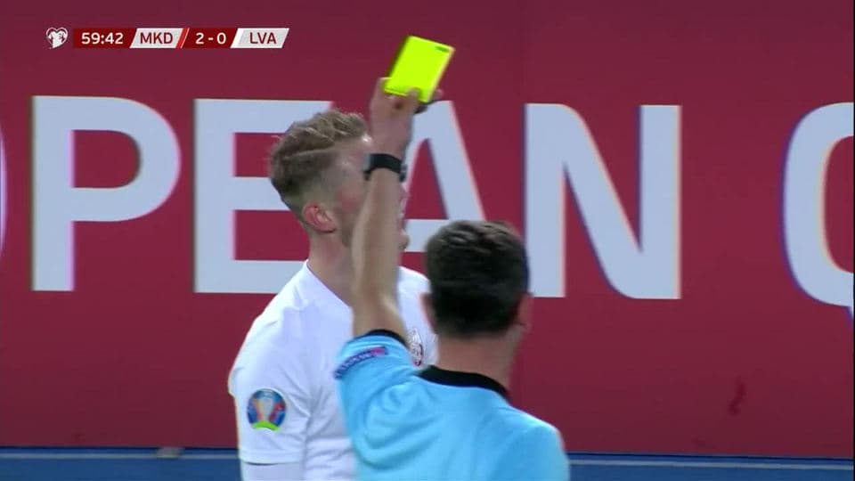 Tarjeta amarilla. El árbitro amonesta a Andrejs Ciganiks de Latvia