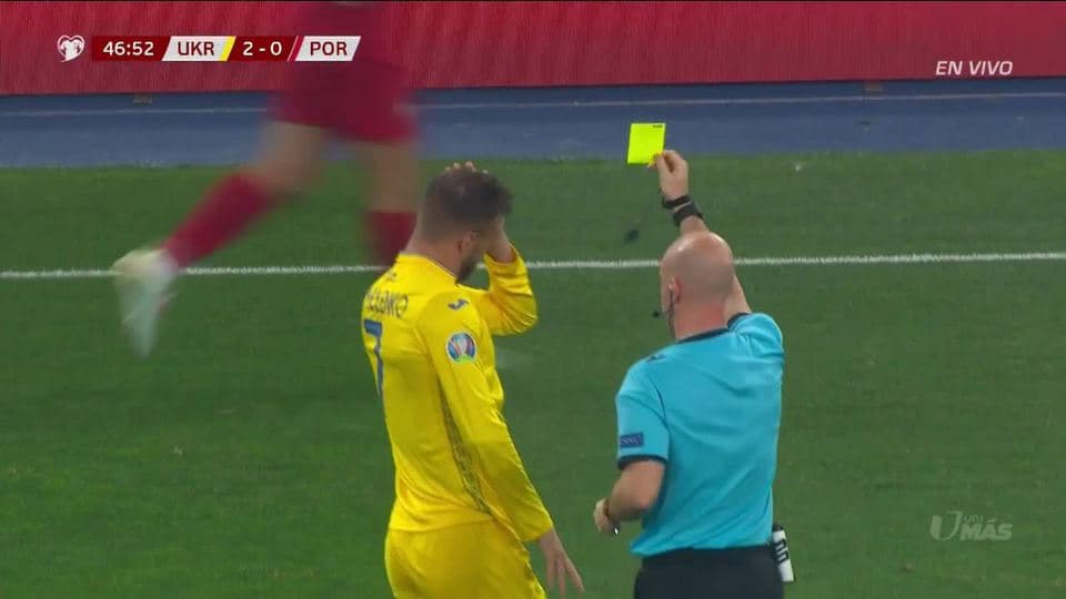 Tarjeta amarilla. El árbitro amonesta a Andriy Yarmolenko de Ukraine