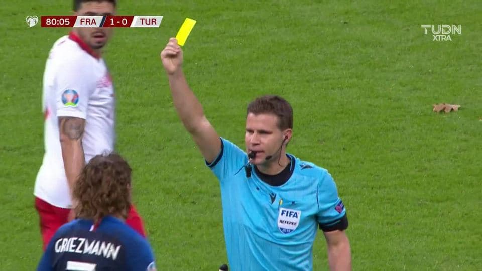 Tarjeta amarilla. El árbitro amonesta a Antoine Griezmann de France