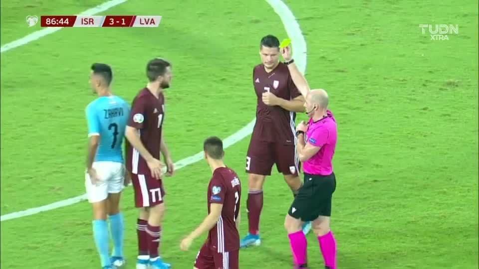 Tarjeta amarilla. El árbitro amonesta a Antonijs Cernomordijs de Latvia