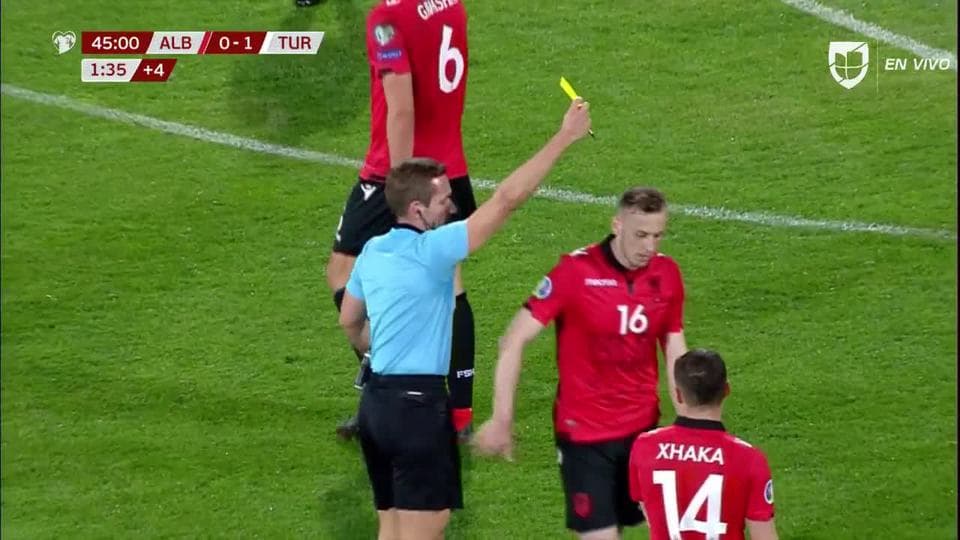 Tarjeta amarilla. El árbitro amonesta a Ardian Ismajli de Albania