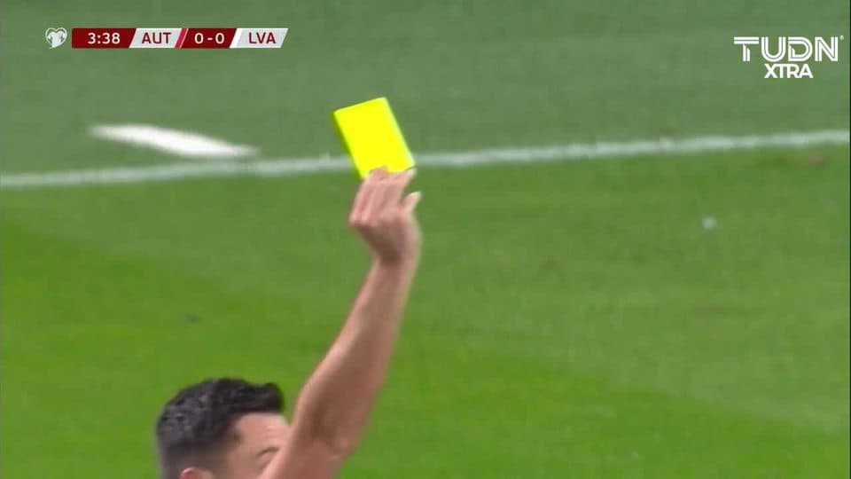 Tarjeta amarilla. El árbitro amonesta a Armands Petersons de Latvia on September 6, 2019