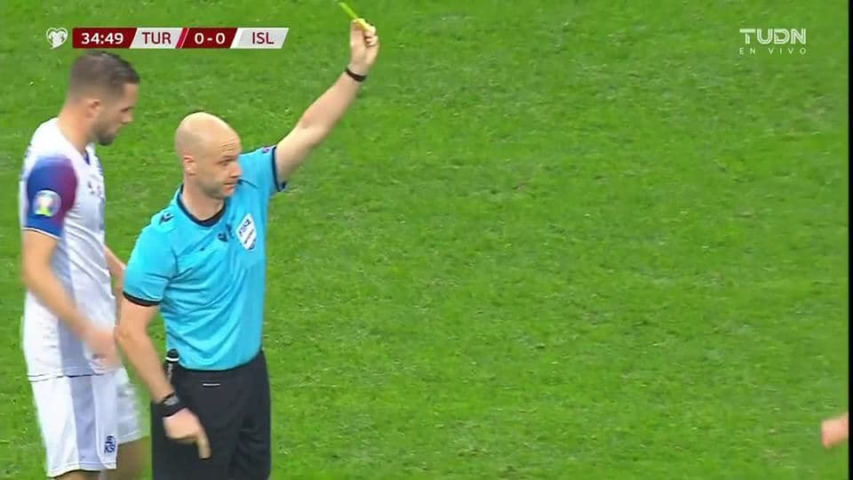 Tarjeta amarilla. El árbitro amonesta a Arnór Ingvi Traustason de Iceland
