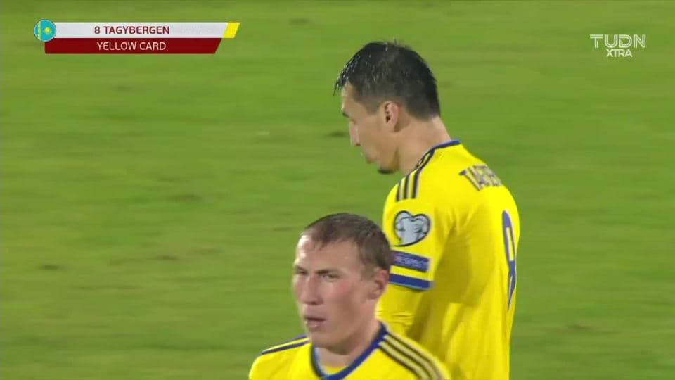 Tarjeta amarilla. El árbitro amonesta a Askhat Tagybergen de Kazakhstan
