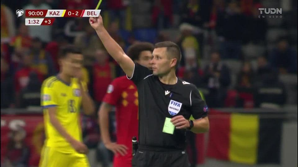 Tarjeta amarilla. El árbitro amonesta a Aybol Abiken de Kazakhstan on October 13, 2019