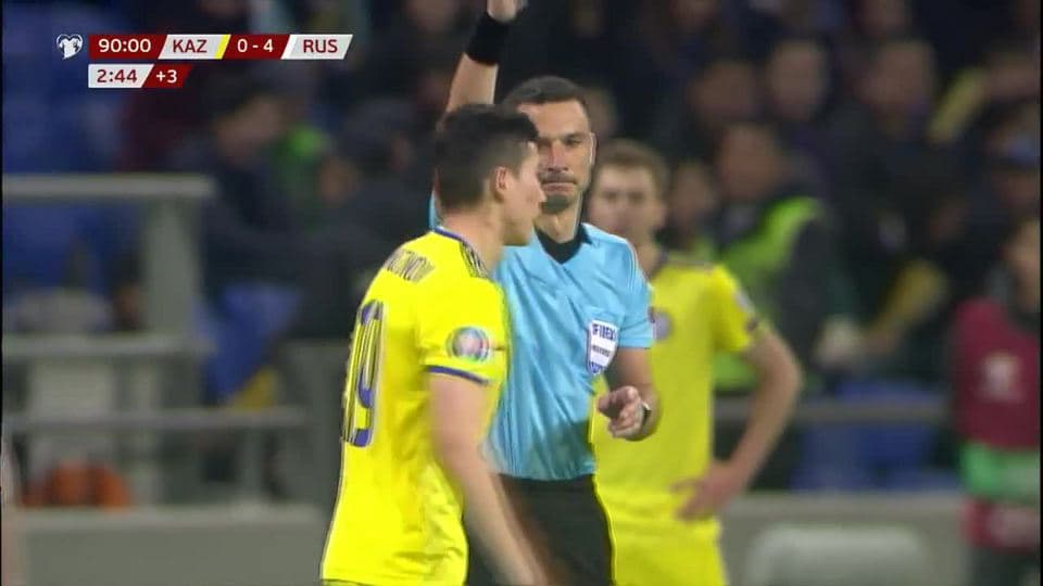 Tarjeta amarilla. El árbitro amonesta a Baktiyor Zainutdinov de Kazakhstan on March 24, 2019
