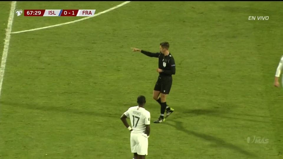 Tarjeta amarilla. El árbitro amonesta a Benjamin Pavard de France