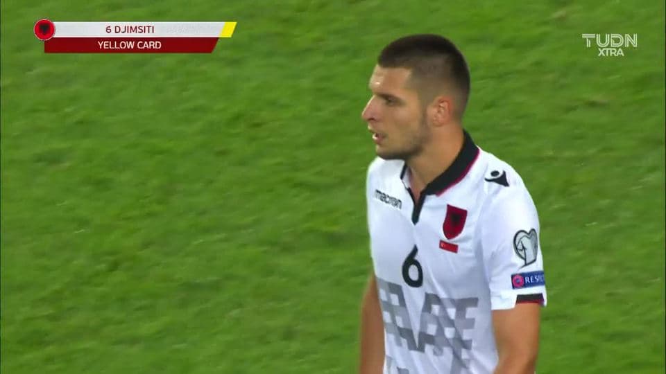 Tarjeta amarilla. El árbitro amonesta a Berat Djimsiti de Albania on October 11, 2019