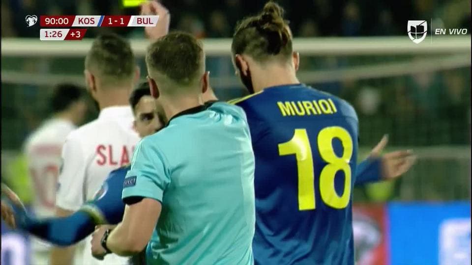Tarjeta amarilla. El árbitro amonesta a Besar Halimi de Kosovo on March 25, 2019