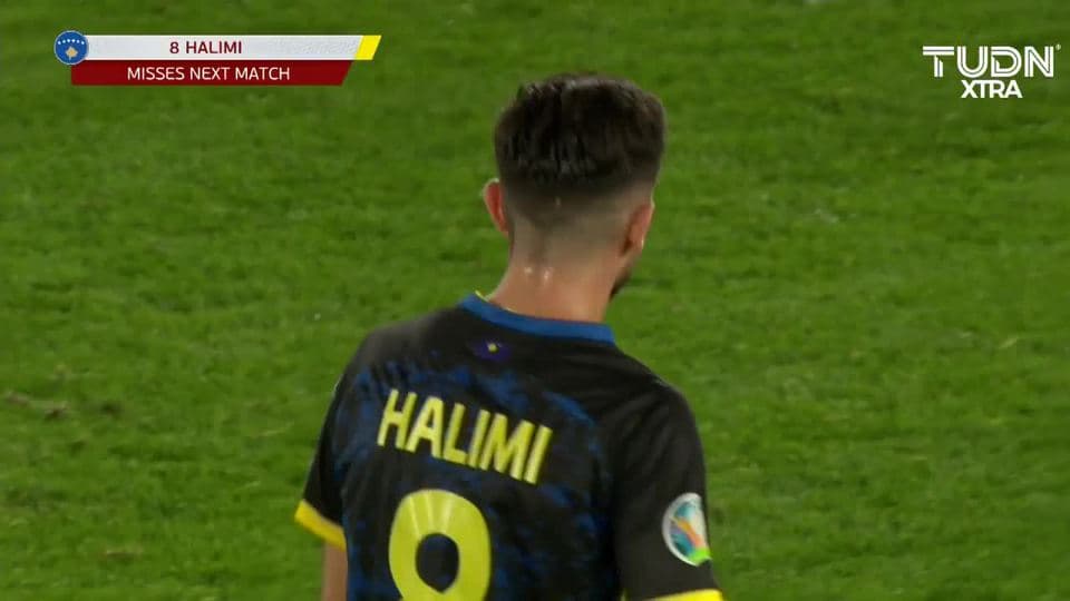 Tarjeta amarilla. El árbitro amonesta a Besar Halimi de Kosovo on September 10, 2019