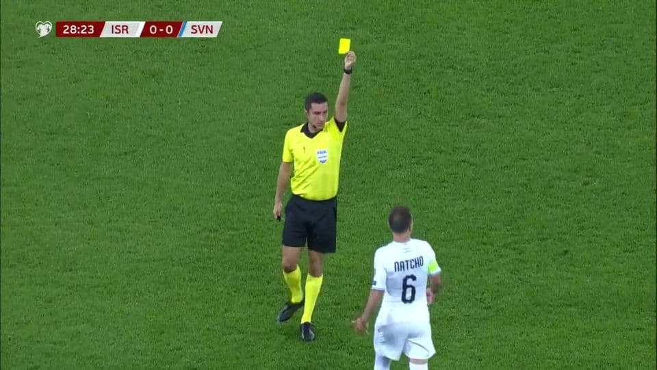 Tarjeta amarilla. El árbitro amonesta a Bibras Natcho de Israel on March 21, 2019