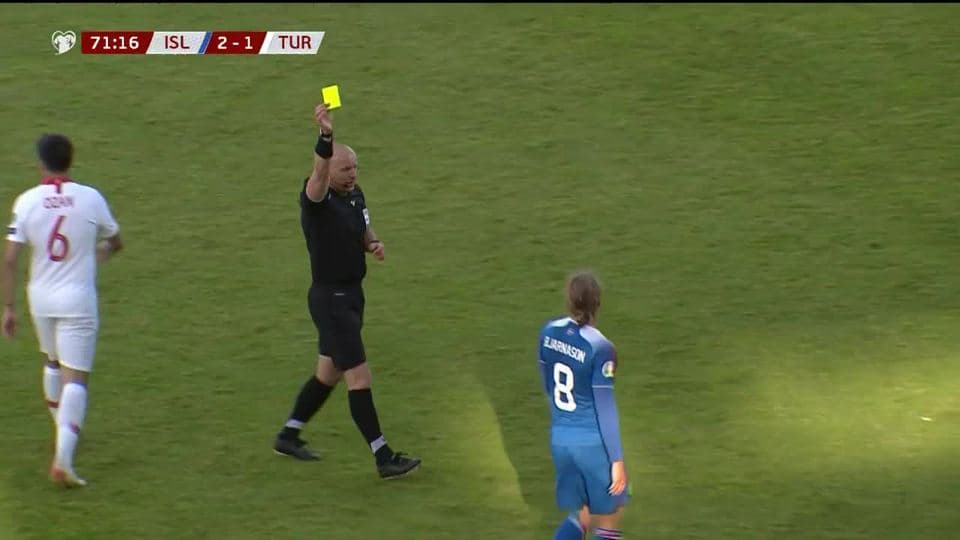 Tarjeta amarilla. El árbitro amonesta a Birkir Bjarnason de Iceland