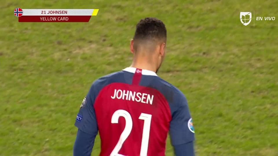 Tarjeta amarilla. El árbitro amonesta a Bjørn Johnsen de Norway on March 26, 2019