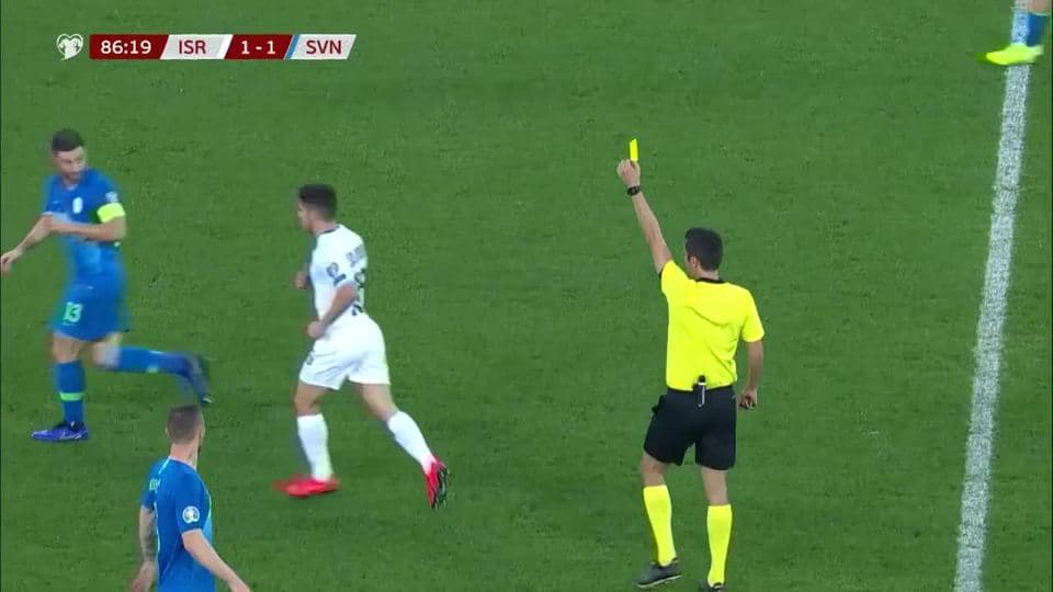 Tarjeta amarilla. El árbitro amonesta a Bojan Jokic de Slovenia on March 21, 2019