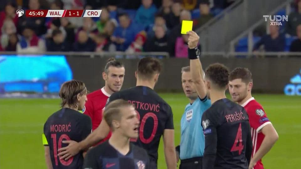 Tarjeta amarilla. El árbitro amonesta a Bruno Petkovic de Croatia