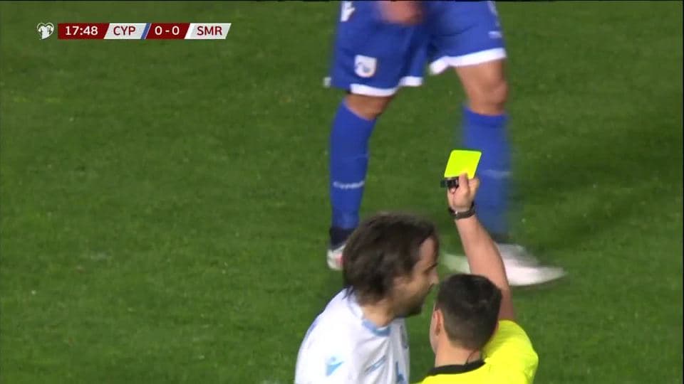 Tarjeta amarilla. El árbitro amonesta a Davide Simoncini de San Marino