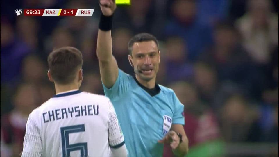 Tarjeta amarilla. El árbitro amonesta a Denis Cheryshev de Russia