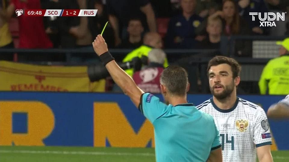 Tarjeta amarilla. El árbitro amonesta a Dimitri Barinov de Russia on September 6, 2019