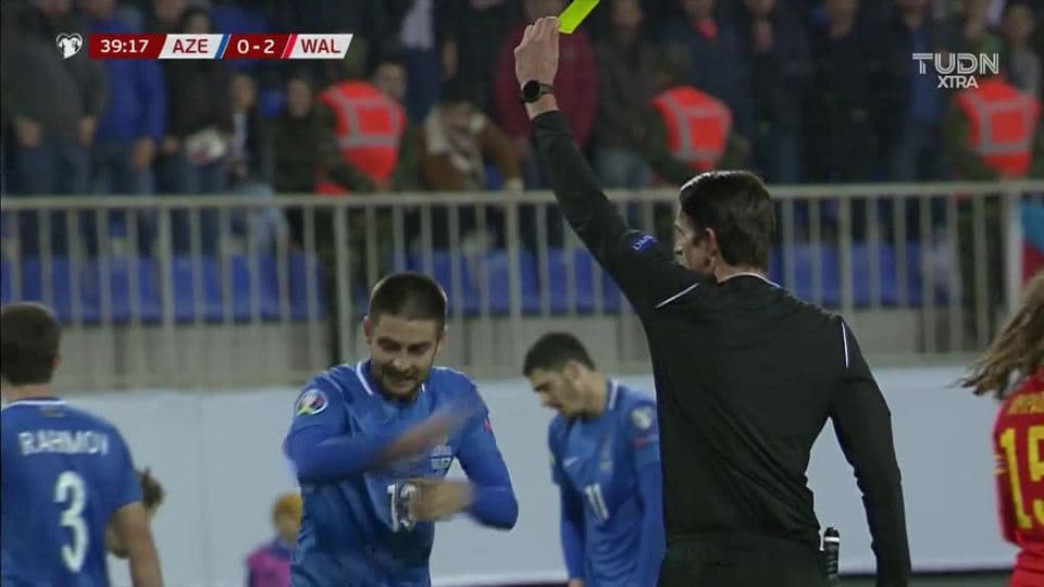 Tarjeta amarilla. El árbitro amonesta a Dimitrij Nazarov de Azerbaijan on November 16, 2019