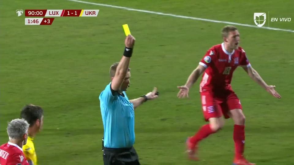 Tarjeta amarilla. El árbitro amonesta a Dirk Carlson de Luxembourg