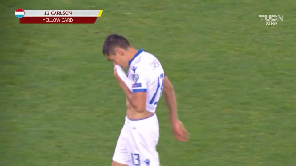 Tarjeta amarilla. El árbitro amonesta a Dirk Carlson de Luxembourg on November 14, 2019