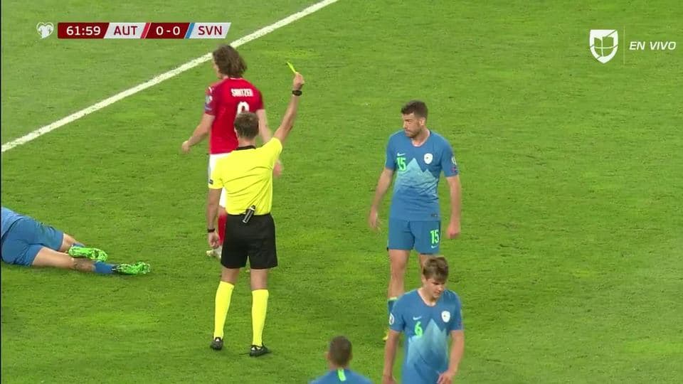 Tarjeta amarilla. El árbitro amonesta a Domen Crnigoj de Slovenia