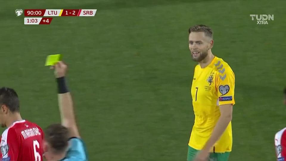 Tarjeta amarilla. El árbitro amonesta a Donatas Kazlauskas de Lithuania