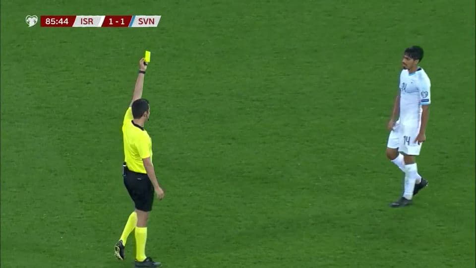 Tarjeta amarilla. El árbitro amonesta a Dor Peretz de Israel on March 21, 2019