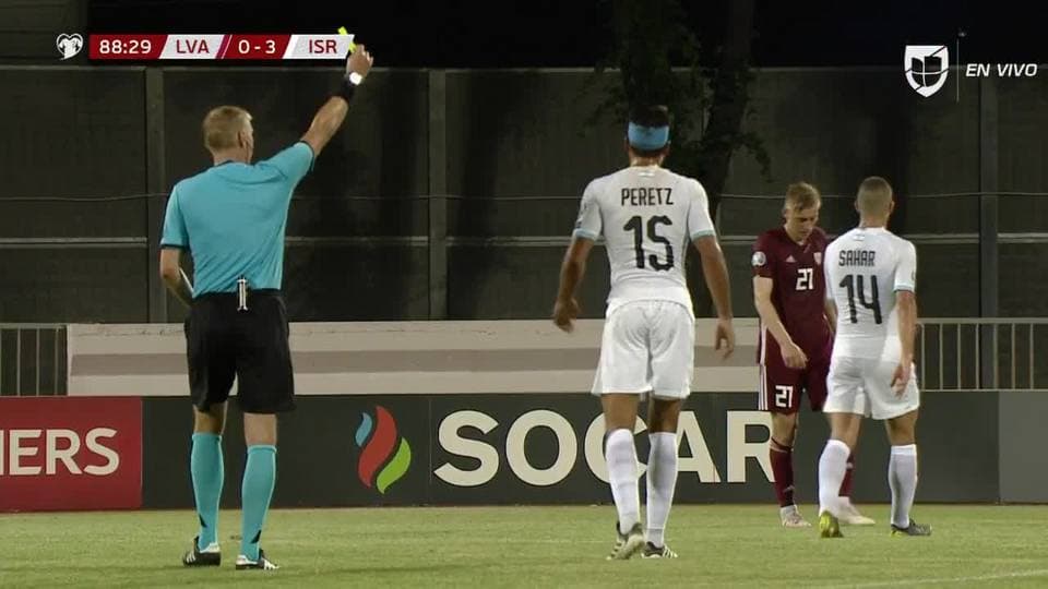 Tarjeta amarilla. El árbitro amonesta a Dor Peretz de Israel