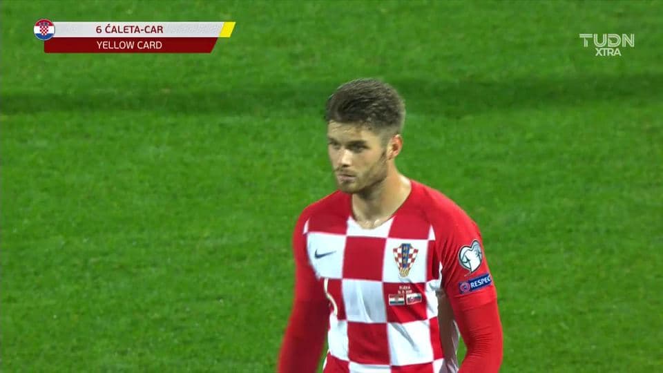 Tarjeta amarilla. El árbitro amonesta a Duje Caleta-Car de Croatia on November 16, 2019
