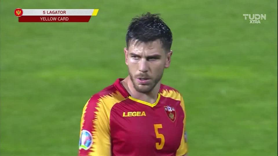Tarjeta amarilla. El árbitro amonesta a Dusan Lagator de Montenegro
