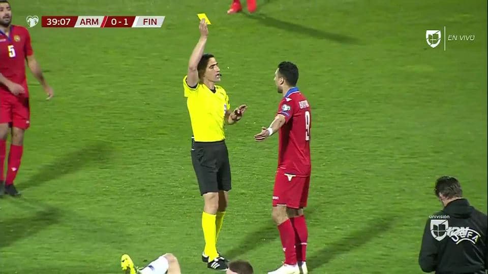 Tarjeta amarilla. El árbitro amonesta a Edgar Babayan de Armenia