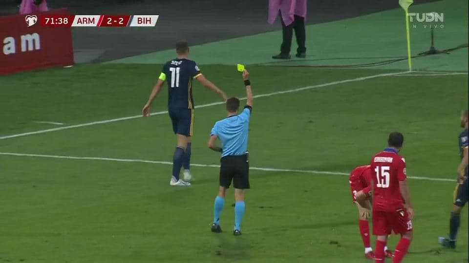 Tarjeta amarilla. El árbitro amonesta a Edin Dzeko de Bosnia and Herzegovina on September 8, 2019