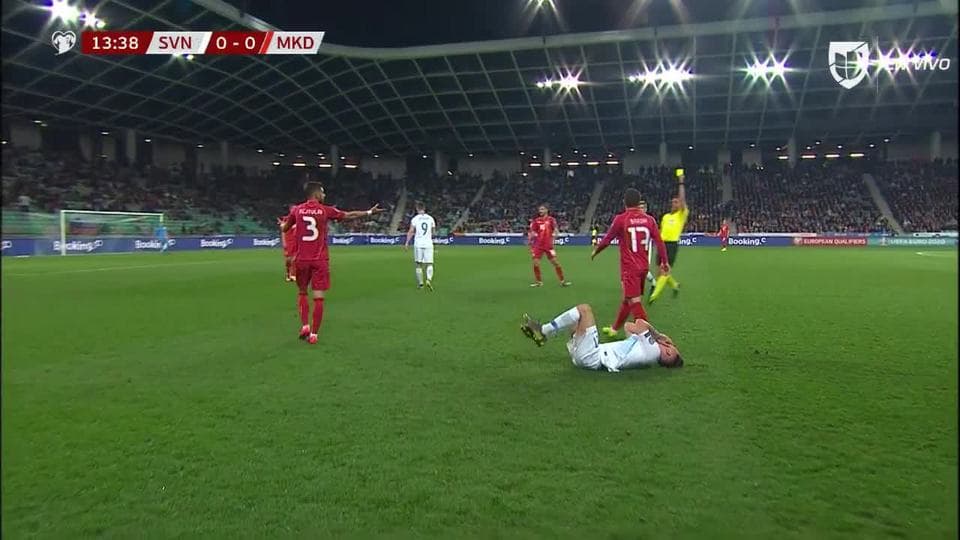 Tarjeta amarilla. El árbitro amonesta a Egzon Bejtulai de Macedonia on March 24, 2019