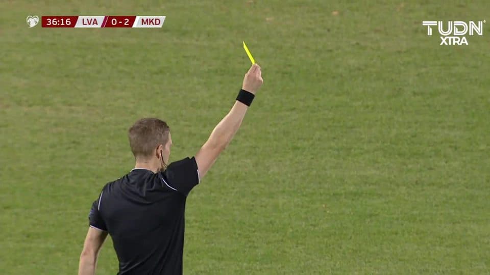 Tarjeta amarilla. El árbitro amonesta a Egzon Bejtulai de North Macedonia
